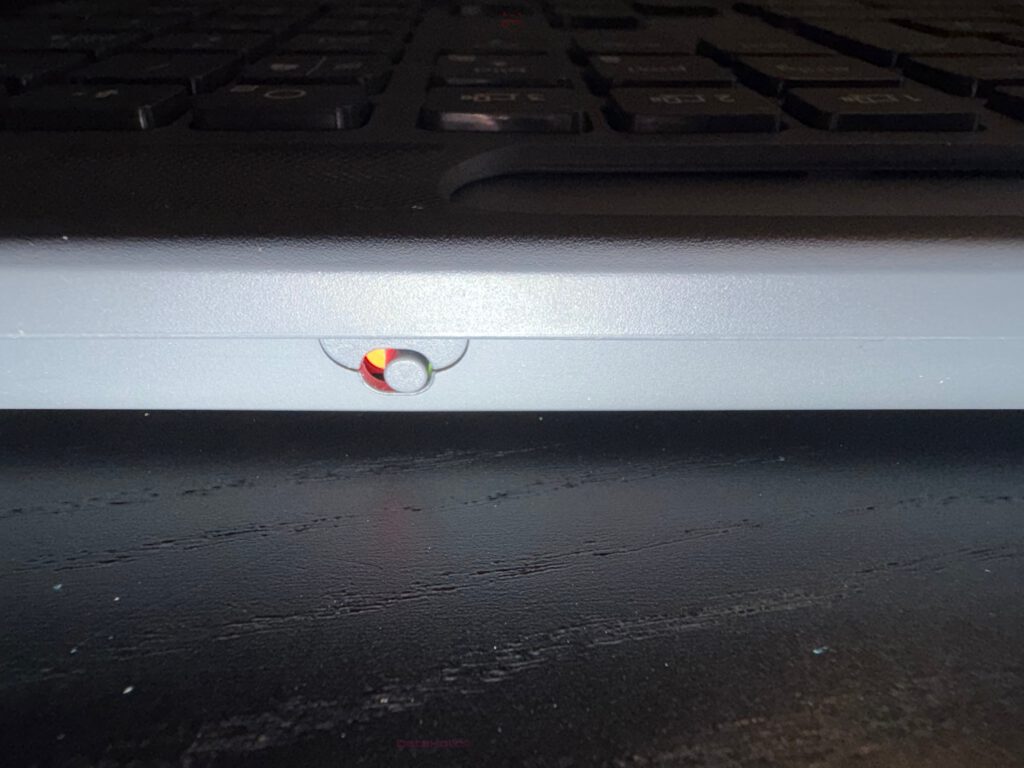 On the back edge sits a sliding power switch — a small, circular toggle with a color indicator: green for on, red for off. The movement feels precise, not loose. Since the keyboard lacks a charging port, this switch is its only direct energy control — and it feels reassuringly solid.