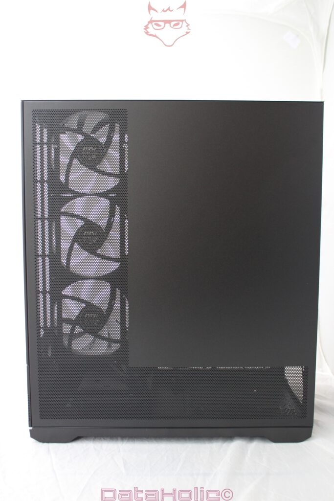 Das linke Seitenteil ist die große Bühne: eine großformatige Tempered-Glass-Pane, leicht getönt, damit Hardware später nicht grell, sondern edel wirkt. In der Ecke die bekannte gelbe „Caution – Tempered Glass“-Warnmarke, die man unzählige Male gesehen hat – ein Ritual für PC-Bauer. Hinter dem Glas zeichnen sich drei vorinstallierte 120-mm-Lüfter an der Front ab: weiße Rotorblätter, schwarzer Rahmen. Diese Linie wirkt ruhig, beinahe skandinavisch, und verspricht eine homogene Lichtstreuung, sollte man später ARGB nutzen.
