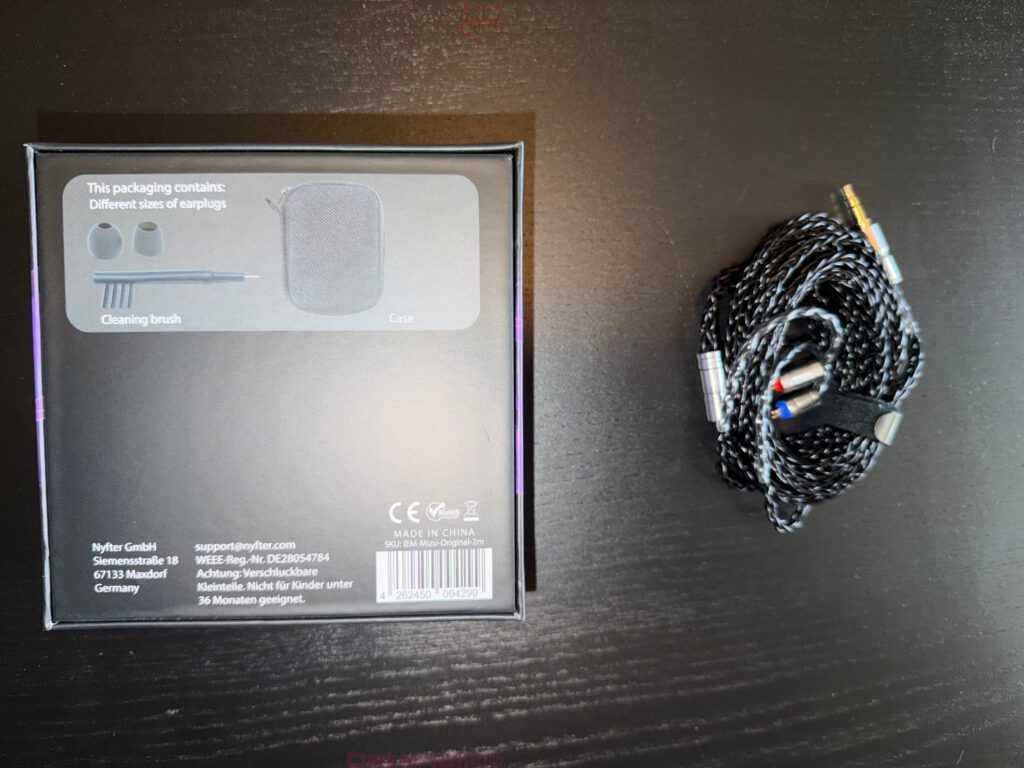 Gerade im IEM-Bereich ist das relevant, weil viele Produkte zwischen zwei Extremen schwanken. Entweder wird extrem minimalistisch verpackt, was schnell nach Sparmaßnahme aussieht, oder die Verpackung versucht mit zu vielen Einlagen und Beschriftungen eine größere Wertigkeit zu erzeugen, als das Produkt später tatsächlich bietet. Die Nyfter-Box bewegt sich dazwischen. Sie wirkt aufgeräumt, direkt und klar genug, um einen ordentlichen ersten Eindruck zu hinterlassen.