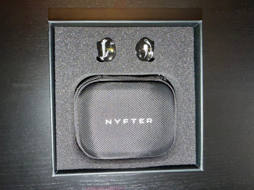 Nach dem Öffnen zeigt sich ein Innenleben, das für ein Produkt dieser Klasse erfreulich ordentlich organisiert ist. Die Ohrhörer sitzen oben in einer passgenauen Schaumstoffeinlage. Direkt darunter liegt ein kompaktes Hardcase mit Nyfter-Branding. Schon an dieser Stelle wird klar, dass die Präsentation nicht nur auf Sichtbarkeit, sondern auch auf Schutz ausgelegt ist. Der Schaumstoff hält die IEMs sicher an Ort und Stelle und verhindert, dass sie lose in der Verpackung liegen oder sich gegenseitig berühren.