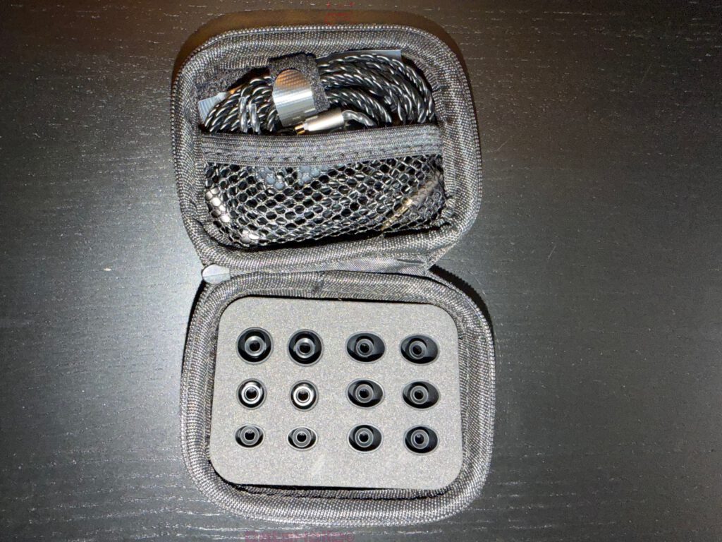 Das Kabel wird im Case zusammen mit weiterem Zubehör untergebracht, was ebenfalls zeigt, dass dieses Set nicht als Wegwerfprodukt inszeniert ist, sondern als modularer Begleiter. Diese Art von Aufbau ist typisch für IEMs, die sich stärker an Enthusiasten oder zumindest an informierte Nutzer richten als an reine Impulskäufer.