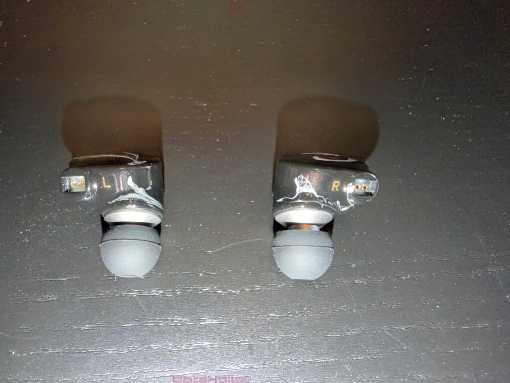 Die IEMs selbst fallen durch ihre kompakte, rundlich-organische Form auf. Die Außenseiten zeigen ein dunkles, glänzendes Finish mit weiß marmorierten beziehungsweise fließenden Linien, wodurch sich ein deutlich dekorativer Eindruck ergibt. Das Design versucht nicht, technisch-kühl oder industriell zu wirken, sondern setzt bewusst auf eine fast schon flüssige, visuelle Struktur. In Verbindung mit dem Namen „Mizu“ ist das gestalterisch naheliegend. Die Oberfläche erinnert an Wasseradern, Tintenverläufe oder polierte Harzoptik.