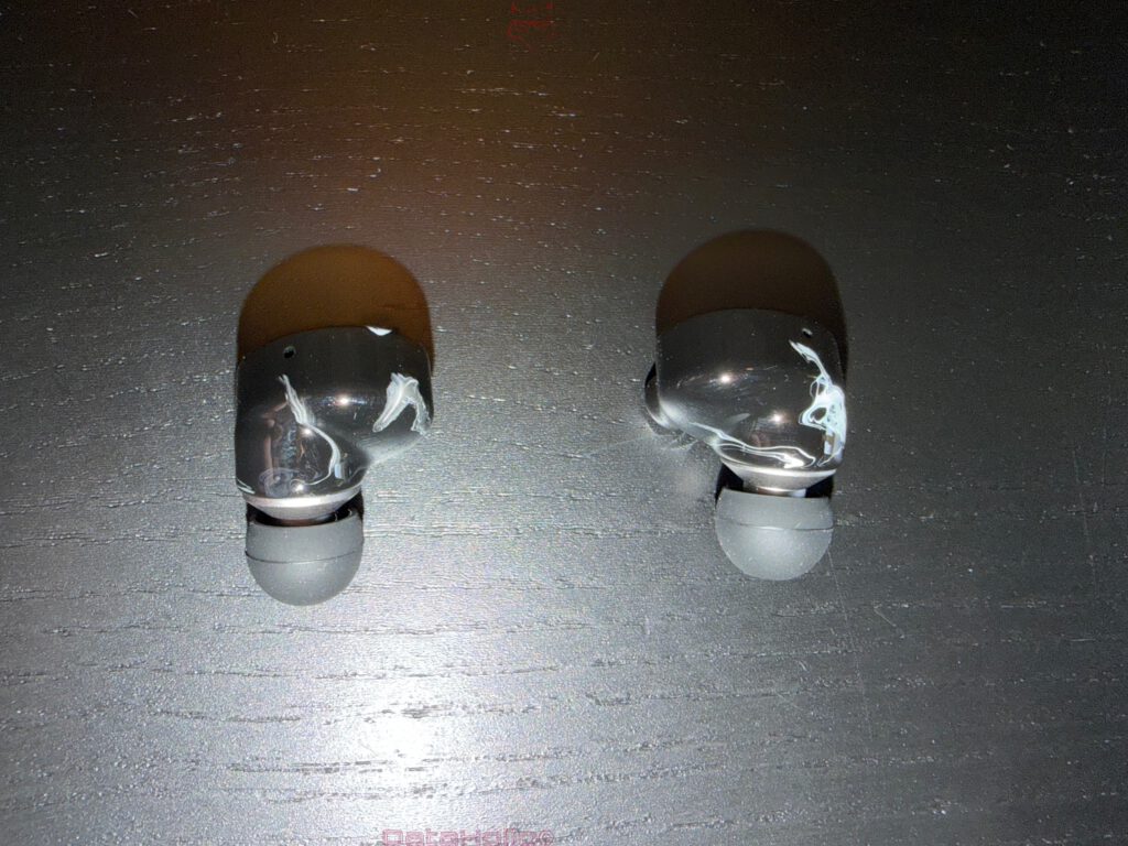 Die Ohrhörer: kompakte Gehäuse mit auffälliger Oberfläche