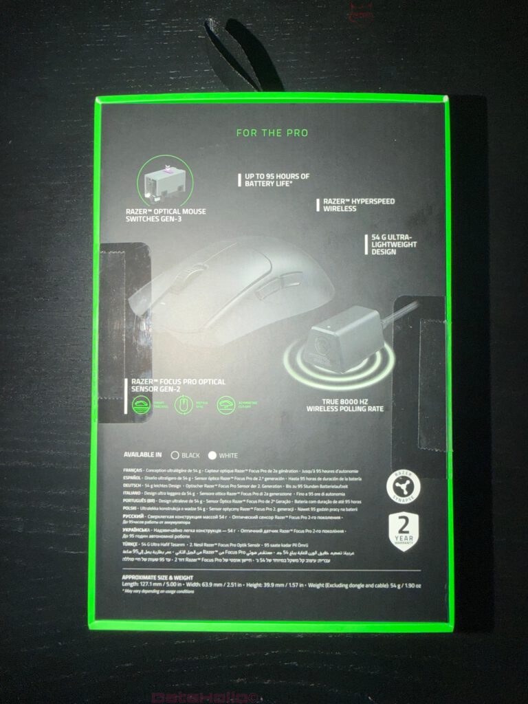 Dreht man die Verpackung, wird es technischer. Hier listet Razer, was dieses Modell ausmacht, aber nicht mit Übertreibung, sondern mit Fokus. Wieder im Zentrum: der Sensor. Der Focus Pro Gen-2 ist laut Hersteller ein Sprung in puncto Tracking-Genauigkeit und Energieeffizienz. Dazu kommen die neuen optischen Switches der dritten Generation, die Verzögerungen mechanischer Klicks eliminieren sollen.