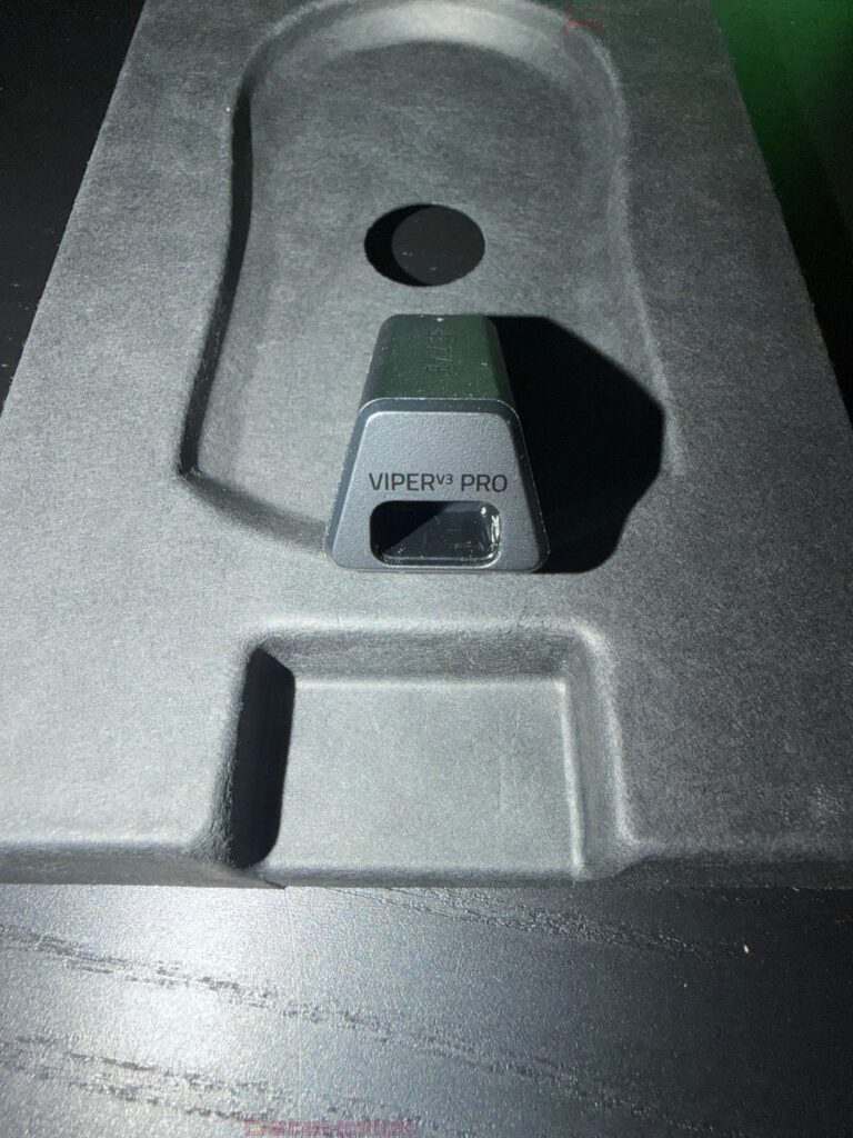 Oben thront die Maus selbst, wie ein Werkzeug in seiner Form. Sie sitzt perfekt im Ausschnitt, die Konturen folgen exakt der Silhouette. Über ihr, leicht eingelassen, liegt der kleine USB-Empfänger-Extender – ein dreieckiges Stück Kunststoff mit klarer Aufschrift: VIPER V3 PRO. Bereits hier lässt sich erahnen, dass das Zubehör nicht Beiwerk, sondern Teil des Systems ist.