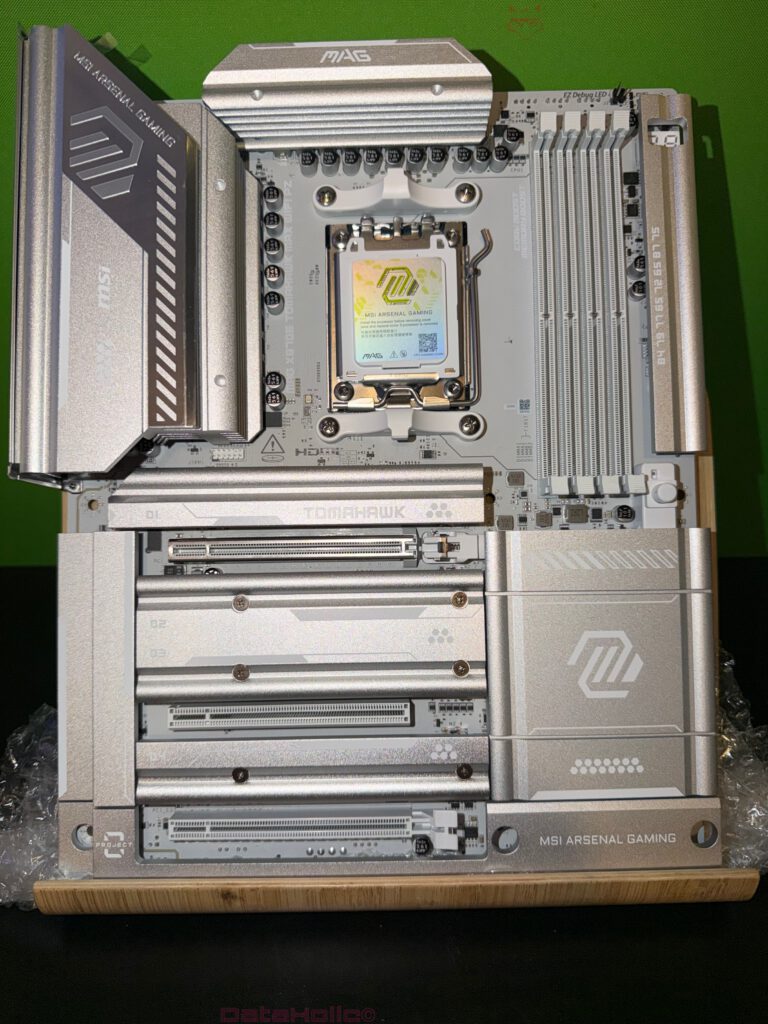 Die monochrome Grundhaltung – silber-graue Kühlkörper, hellgraue DIMM-Slots, dezentes TOMAHAWK-Branding – verzichtet bewusst auf auffällige Farbinseln. Das passt zu Builds, die schlicht, weiß oder metallisch gehalten sind. Die Typografie ist kantig-technisch, ohne Dominanz. Ein typisches Beispiel dafür, wie MSI die MAG-Serie seit Jahren positioniert: werkzeughaft vor dekorativ.