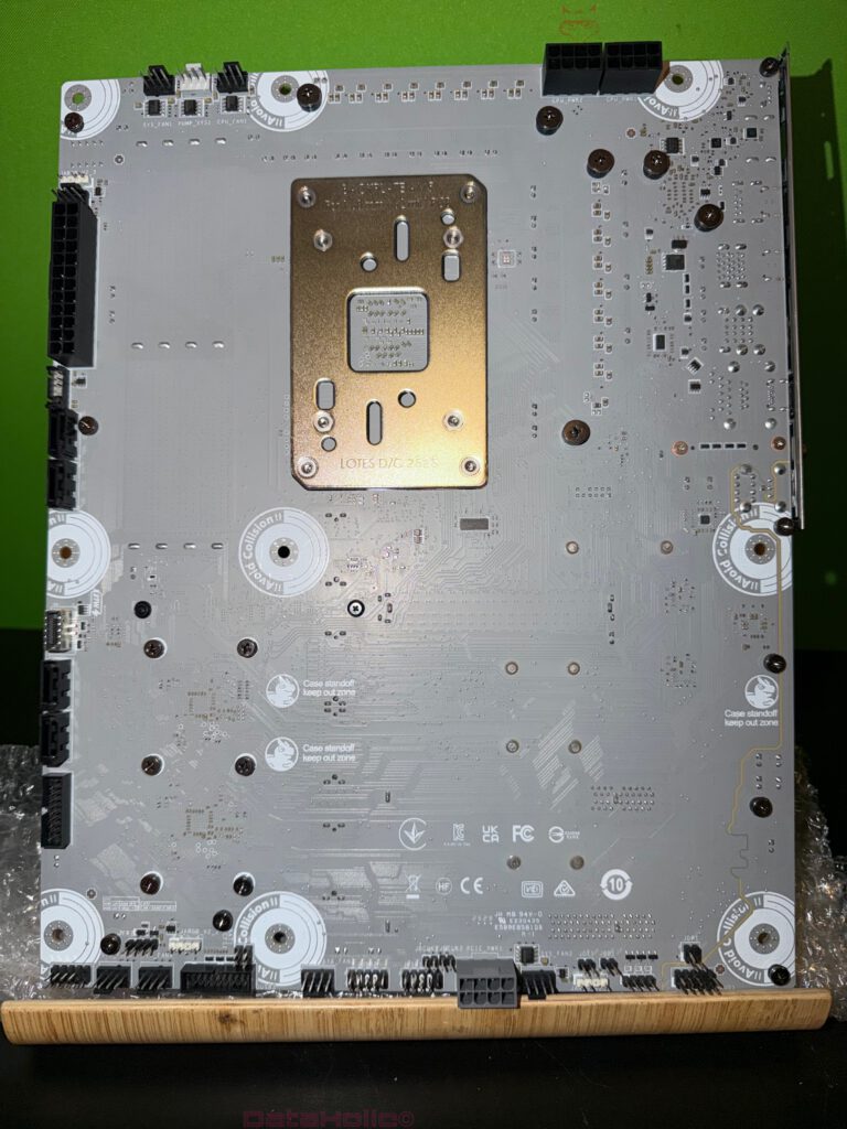 Die Rückseite des Boards ist das Alleinstellungsmerkmal der PZ-Variante. Entlang der Außenkante sind ATX-24-Pin, EPS-8-Pin, Front-Panel-Header, USB-Header und weitere Anschlüsse rückseitig angeordnet. Deutlich gedruckte „Keep-Out“-Markierungen zeigen, wo Gehäuse-Abstandshalter sitzen dürfen und wo nicht. Das Ergebnis im fertigen System: keine sichtbaren Hauptkabel in der Sichtkammer, verkürzte Wege und ein spürbar aufgeräumteres Innenbild – vorausgesetzt, das Gehäuse bietet hinten ausreichend Kabelführungen und Tiefe.
