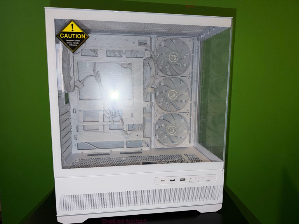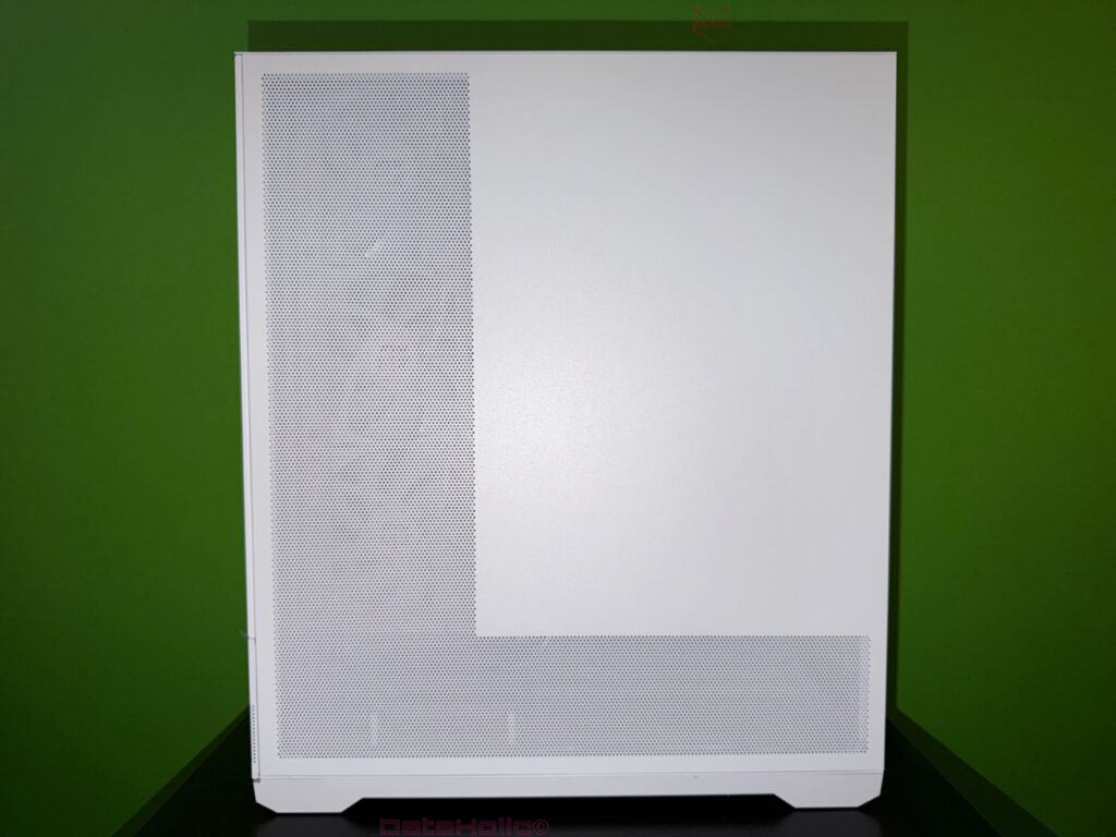 Die White-Edition wirkt klar und geometrisch. Charakteristisch ist die Panorama-Glasführung: eine breite Glasfläche an der linken Seite und ein zusätzlicher Glaskörper zur Front hin (modellbedingt: großflächiges Fenster, abgesetzte Mesh-Zone je nach Blickseite). Das rechte Seitenpanel ist als fein gelochte Stahlfläche ausgeführt und unterstützt die Frischluftzufuhr. An der Frontunterkante sitzt das I/O-Panel mit: