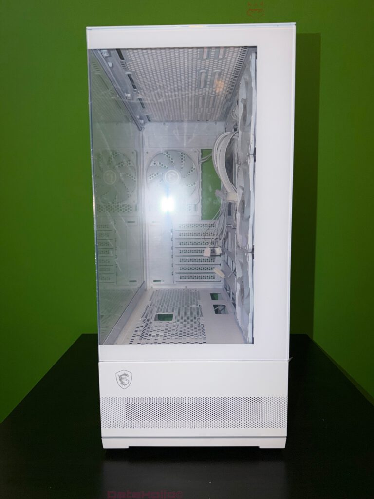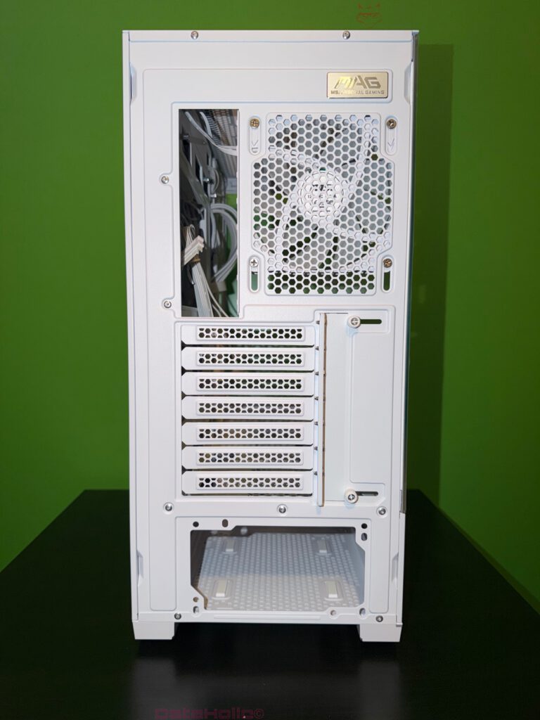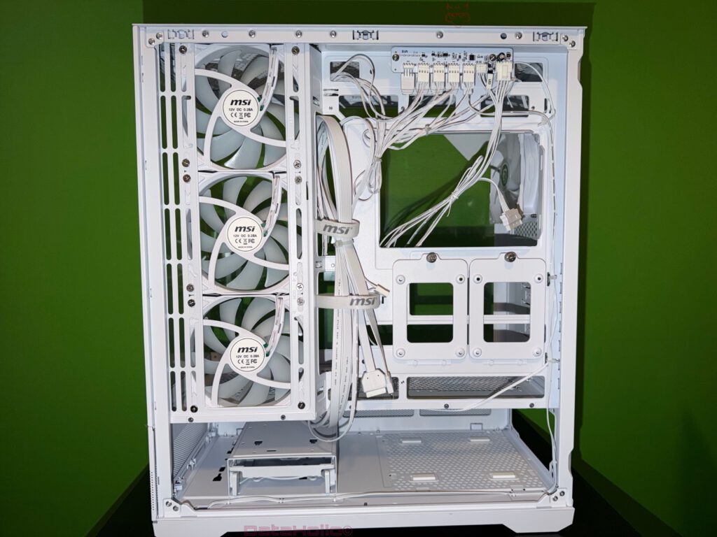 Im Auslieferungszustand sind auf der Front drei 120-mm-Lüfter (weiß) vormontiert; zusätzlich befindet sich rückseitig ein 120-mm-Exhaust. Auffällig ist ein vorkonfektionierter Lüfter-Hub im Deckelbereich hinter dem Mainboard-Tray. Mehrere Kabelbinderpunkte, Klettbänder mit MSI-Branding und weitläufige Kabelkanäle charakterisieren die Rückseite. Im Bodenbereich ist ein modularer Laufwerks-/PSU-Raum ausgeführt; der Innenraum ist für ATX-Boards dimensioniert und bietet klare Freiräume für lange Grafikkarten.