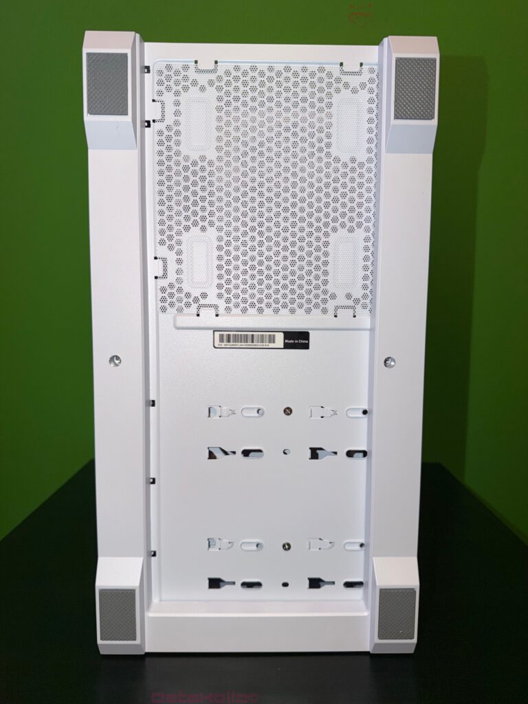 Die Materialanmutung ist sauber: lackiertes Stahlblech ohne scharfe Kanten, sauber entgratete Durchführungen, eine stabile Front/Mesh-Einheit. Der Weißton ist über alle Komponenten hinweg konsistent – ein Punkt, der bei White-Builds oft auffällt.