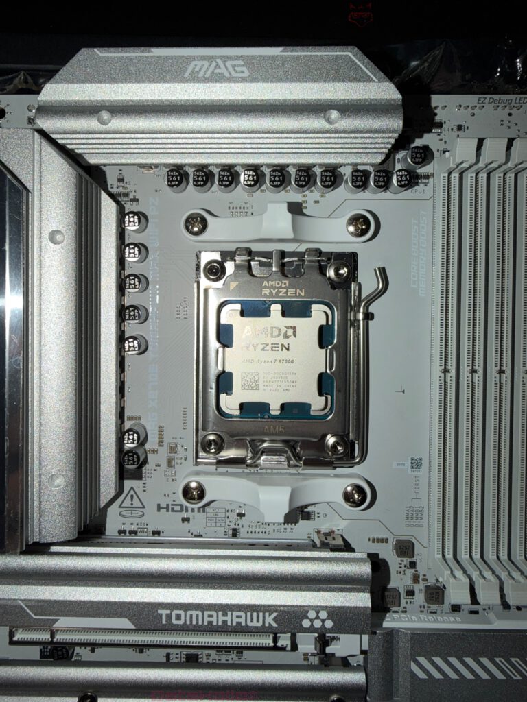 Die monochrome Grundhaltung – silber-graue Kühlkörper, hellgraue DIMM-Slots, dezentes TOMAHAWK-Branding – verzichtet bewusst auf auffällige Farbinseln. Das passt zu Builds, die schlicht, weiß oder metallisch gehalten sind. Die Typografie ist kantig-technisch, ohne Dominanz. Ein typisches Beispiel dafür, wie MSI die MAG-Serie seit Jahren positioniert: werkzeughaft vor dekorativ.
