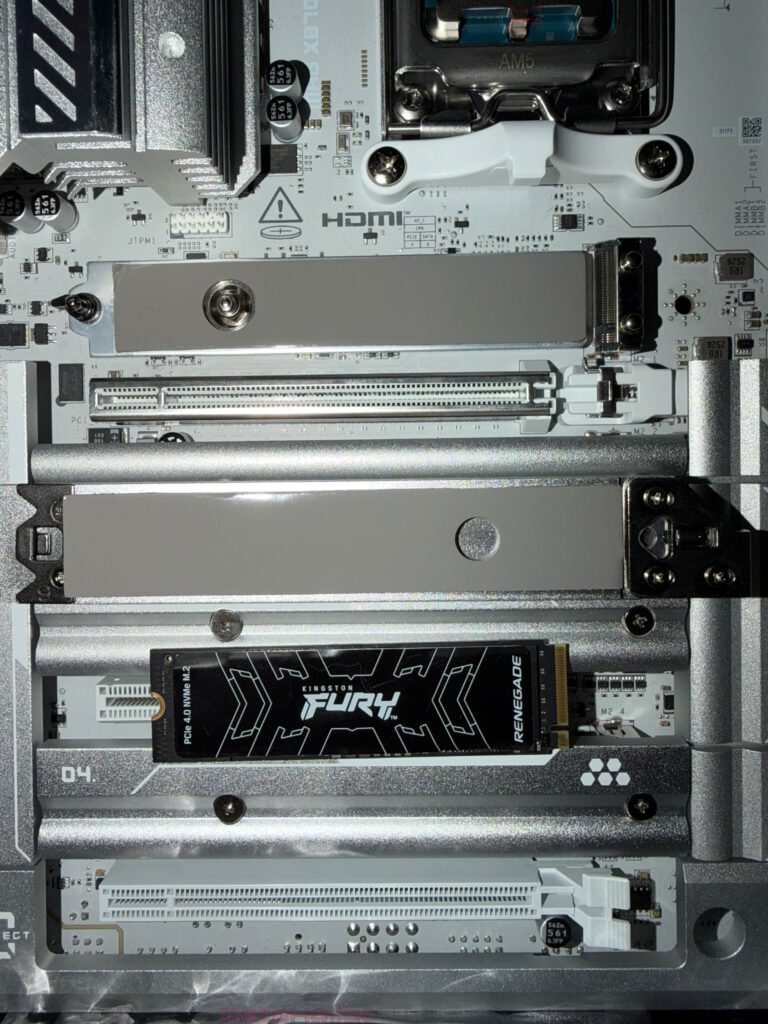Für den initialen Aufbau wurden M.2-SSDs hinter den EZ M.2 Shield Frozr II-Abdeckungen montiert. Das werkzeugarme Konzept verkürzt die Screentime spürbar. Für 2,5- und 3,5-Zoll-Drives sind im unteren Bereich Montageplätze vorhanden; dank der perforierten Böden bleibt der Airflow im PSU-Kanal erhalten.