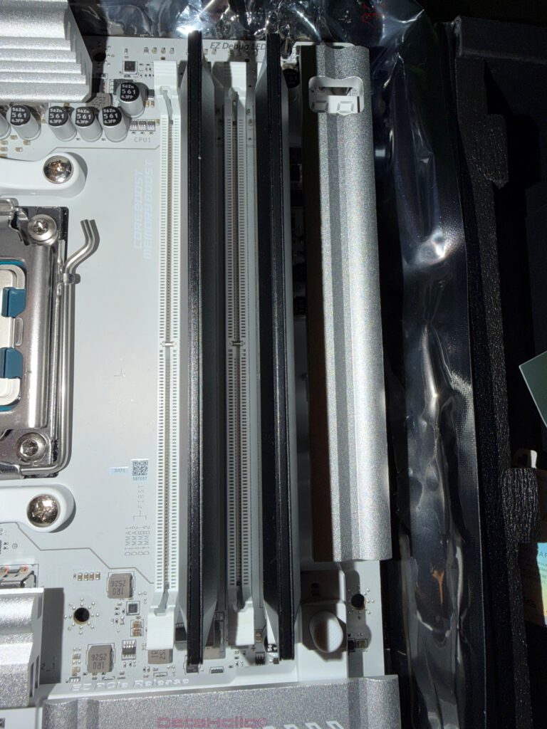 Zwischen AM5-Sockel und DDR5-Bänken bleibt spürbar Platz für gängige Luftkühler-Geometrien. Die vier DDR5-DIMM-Slots sind in hellem Grau gehalten; die bevorzugte Bestückungsreihenfolge (A2/B2 vor A1/B1) ist kontrastreich aufgedruckt. Markierungen für QVL-relevante Taktstufen finden sich – platformtypisch – in der Dokumentation.