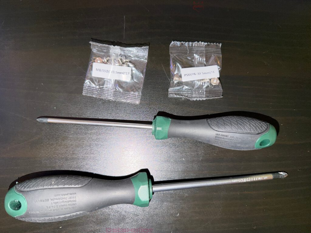 - Mainboard-, PSU- und Laufwerksschrauben (etikettiert),