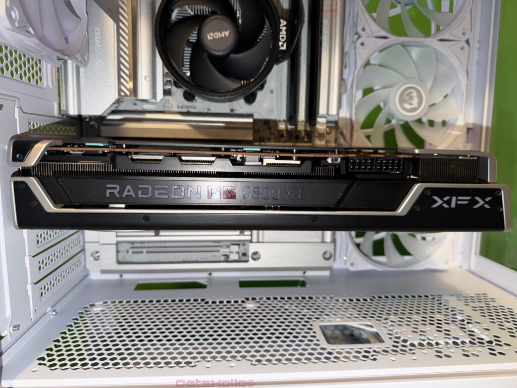 Das Case lässt viel Spielraum für lange Grafikkarten und hohe Kühler. Die Front-Lüfter sitzen auf einem verschraubten Rahmen, der je nach Radiator-Planung umgesetzt werden kann. Der Deckel bietet großflächige Öffnungen; wer später eine AiO oder einen 280/360-Radiator nachrüsten möchte, findet ausreichend Platz. Im White-Konzept überzeugt die Farbkonsistenz zwischen Case, Lüftern und dem silbrig-grauen Mainboard besonders.